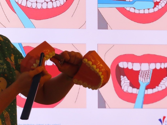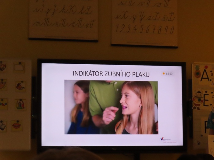 Po zopakování, co se děti minule naučily, si zahrály divadlo, učily se pečlivě velkým kartáčkem odstraňovat nečistoty, zkoušely si druhy kartáčků a pohmatem na obřích kartáčcích si uvědomovaly, že měkký je jim příjemnější. Poté dostaly opět svůj vlastní - nový kartáček, se kterým si vše znovu vyzkoušely přímo na sobě. Na závěr dostaly zábavné pracovní listy a indikátor zubního plaku s vysvětlením, jak se používá.