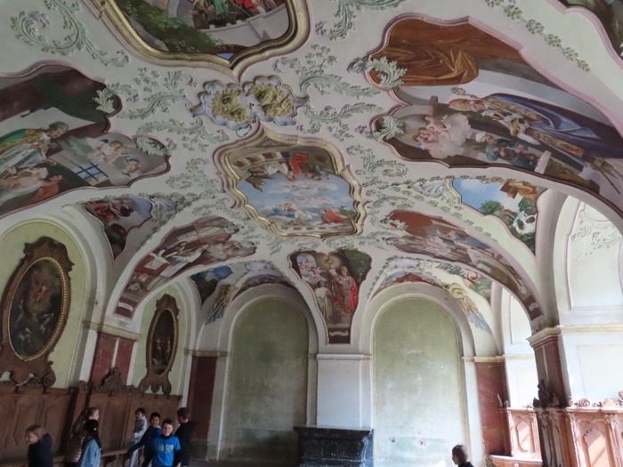 Ještě jsme prošli klášterní jídelnu s krásnou výzdobou a s okénkem do kuchyně, z kuchyně jsme šli do sklepení, kde je lednice- spižírna, která byla dříve obložená kostkami ledu, tak jsme dostali sladkou odměnu a rozjímali jsme v tichu v rajské zahradě.