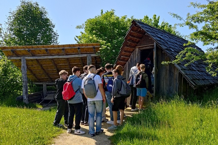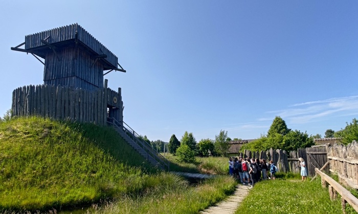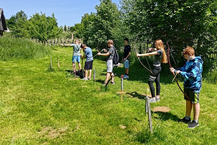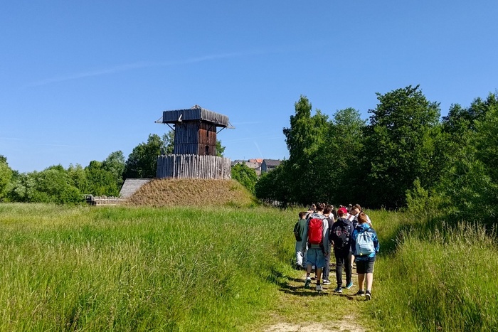 Archeologické muzeum ve skanzenu nás pozvalo na fascinující cestu časem do všedního dne 9. až 13. století. Při prohlídce jsme se prošli raně středověkou slovanskou vesnicí, vylezli na impozantní, hradbou obehnanou obytnou věž na umělém pahorku z 11. století, a nakonec jsme se dostali do osady z vrcholného středověku. Upekli jsme si chléb a také došlo na střelbu z luků. Po celý den nás provázela česká průvodkyně. Navíc, vydařilo se nám počasí. Lepší jsme si ani nemohli přát.