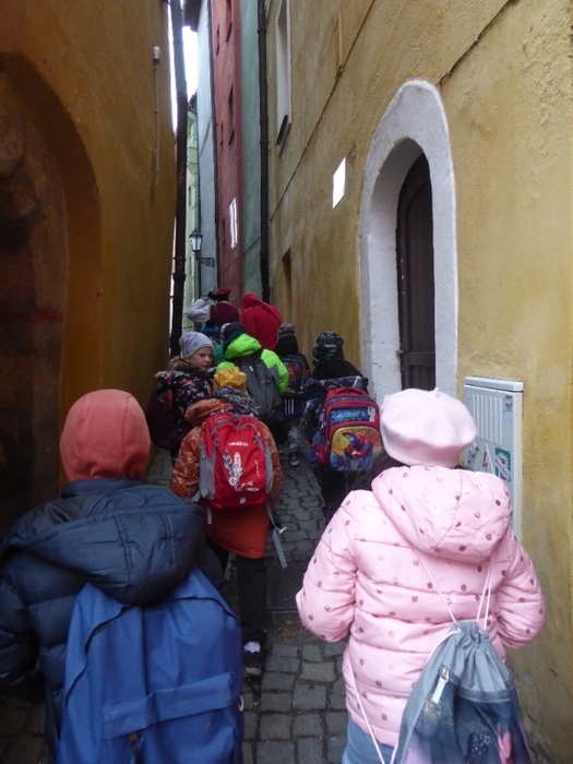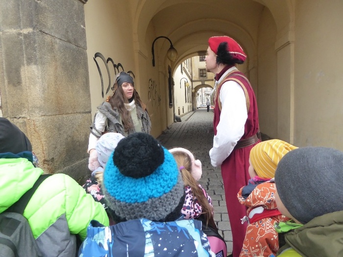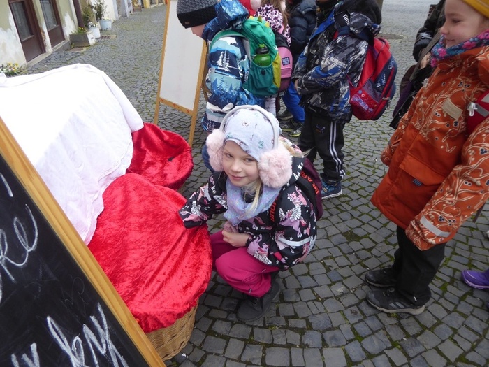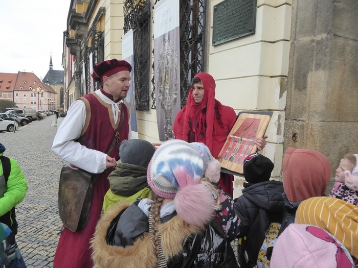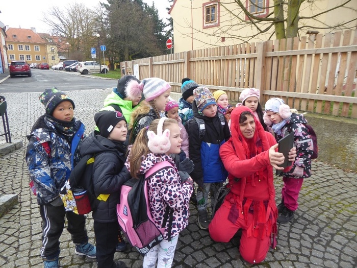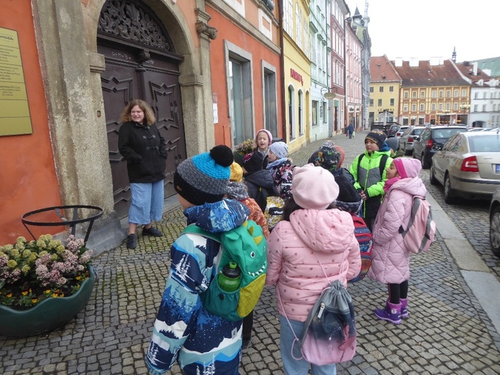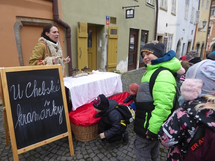 Pomocí QR kódu jsme si prohlédli na tabletu dřívější podobu některých historických budov, zjistili jsme jak dřív hasili požár a jaká to byla pohroma, když hořelo, dozvěděli jsme se které náměstí je nejstarší, seznámili jsme se s purkmistrem, kramářkou, glejtem, pomocí hmatu jsme se dozvěděli, které výrobky naše město proslavily ve středověku, jaká privilegia město mělo, objasnili jsme si obrázky na chebském znaku a hledali jsme, kde všude na náměstí máme erb, zjistili jsme k čemu sloužili kramářské písně a jaké zajímavé domy máme na náměstí a jaké historické osoby v nich bydleli, kdo všechno do města směl a kdo do města nesměl, při stopovačce jsme vypátrali klíč na faře k truhle s pokladem a pomocí vědomostního kvízu jsme rozluštili otevírací kód a pochutnali jsme si na čokoládovém pokladu a po svačině jsme ve skupinkách vymýšleli svá vlastní města, která jsme pak představili všem - jak se jmenují a proč, co mají v erbu a čím je město vyhlášené a co by návštěvníky ve městě zaujalo.