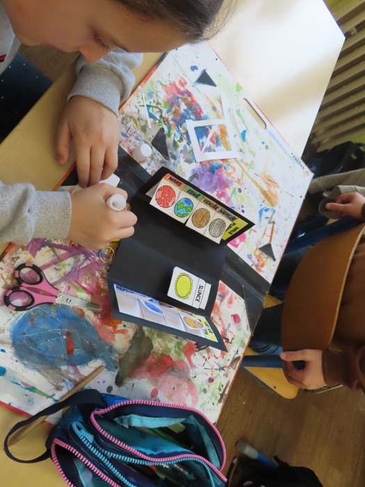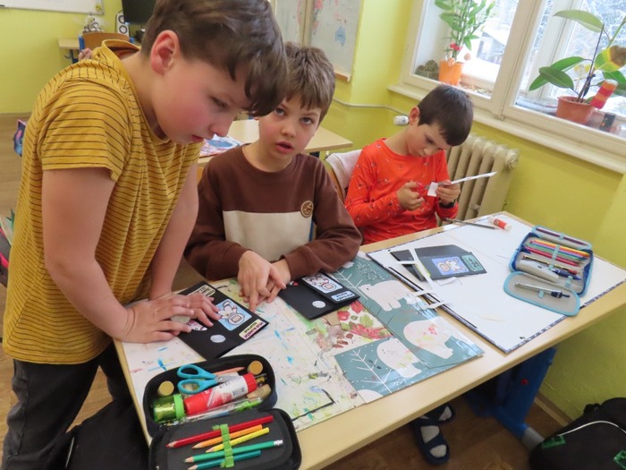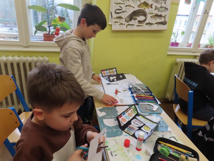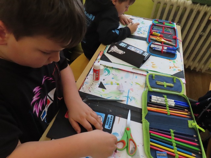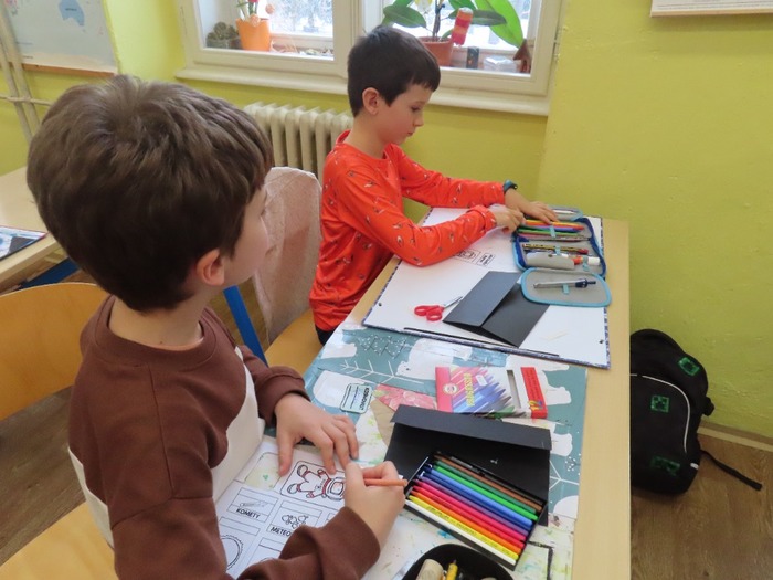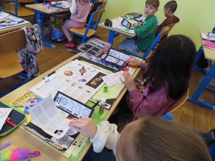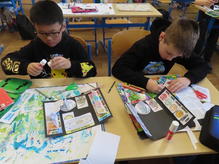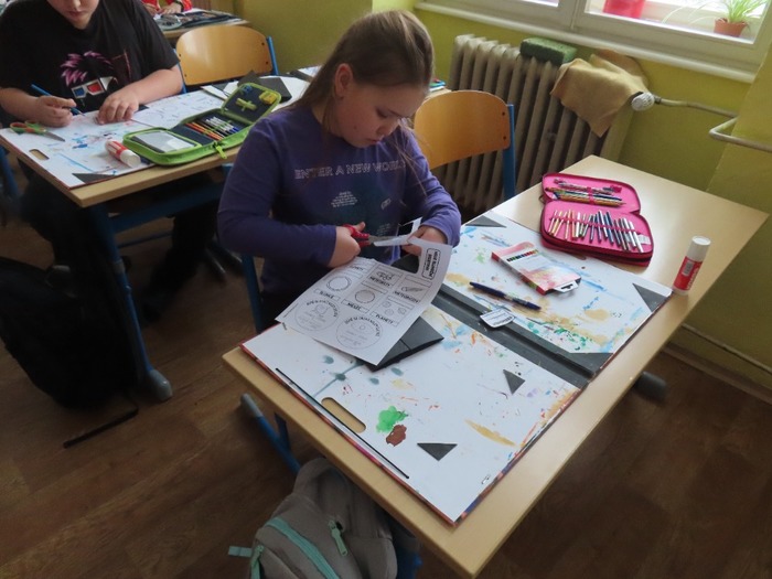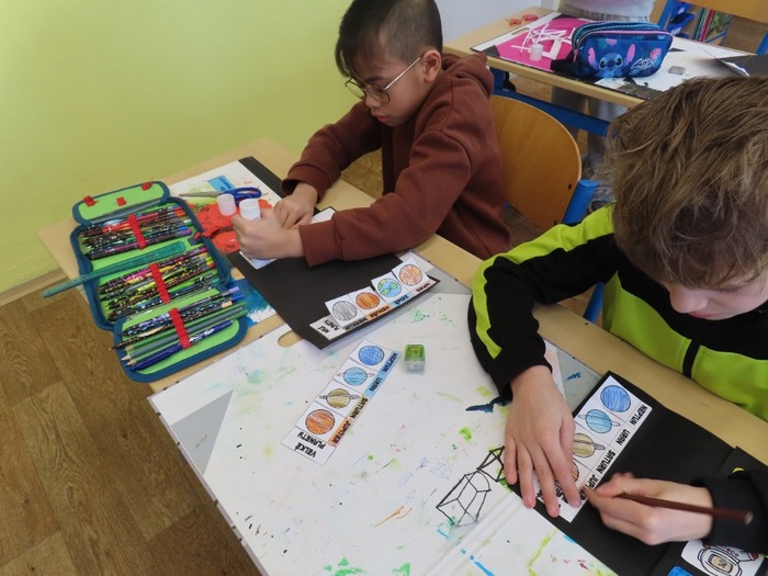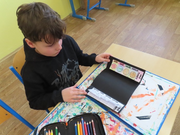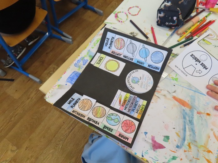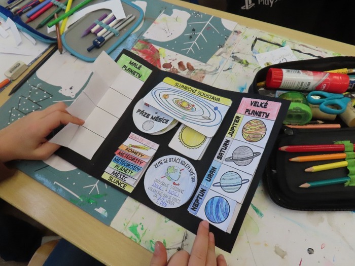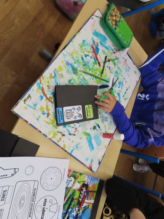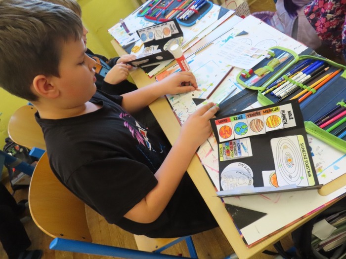 Trval průběžně celý týden, kdy jsme využívali hodin Prvouky, VV a Čj - Čtení, celkem jsme potřebovali 5 hodin, ale výsledek stál za to. První den jsme si vyrobili skládací knihu, pojmenovali jsme si svého kosmonauta a přilepili jsme mu raketu. Další hodinu jsme do knihy vlepili planety Sluneční soustavy, které jsme si rozdělili na malé a velké, další den jsme pracovali na středu naší knihy - Lapbooku - máme tam informace o Slunci, pohybech Země kolem své osy a kolem Slunce, další objekty - meteority, komety,...a dráhy planet ve Sluneční soustavě. Poté jsme se věnovali jednotlivým planetám a třídili informace o každé a poslední hodinu jsme si vyráběli pohyblivý model - Fáze Měsíce.