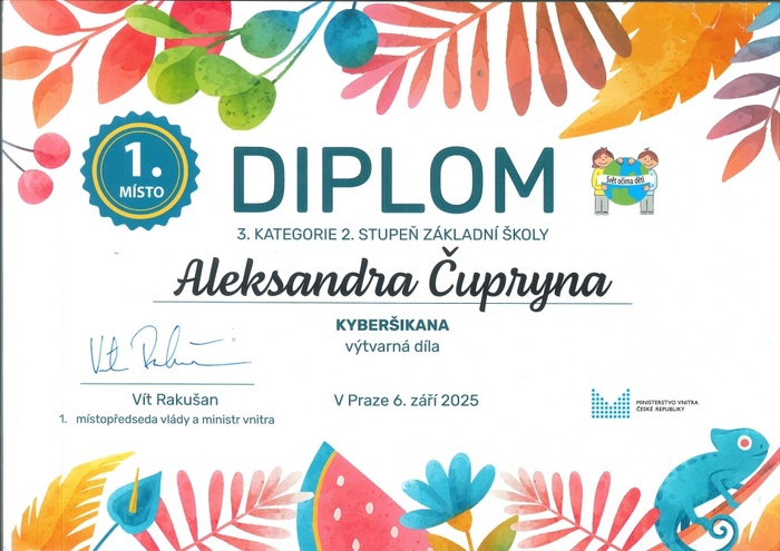 Dne 6. září 2025 proběhlo v Praze v areálu Ministerstva Vnitra ČR slavnostní předávání cen 22. ročníku celostátní výtvarné soutěže „Svět očima dětí“. Naše dvě žákyně dosáhly skvělých úspěchů v kategorii žáků II. stupně. Věra Pucherová získala úžasné 1. místo v tématu „80. výročí konce 2. sv. války“ a Aleksandra Čupryna též nádherné 1. místo v tématu „Kyberšikana“. Dívkám moc gratulujeme a děkujeme za skvělou reprezentaci školy!
